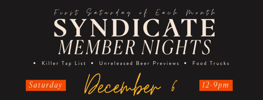 Come by the barrel house for a curated tap list including some unreleased previews and other special & unique beers. It’s a great time to pick up any held orders and hang out with fellow Syndicate members.