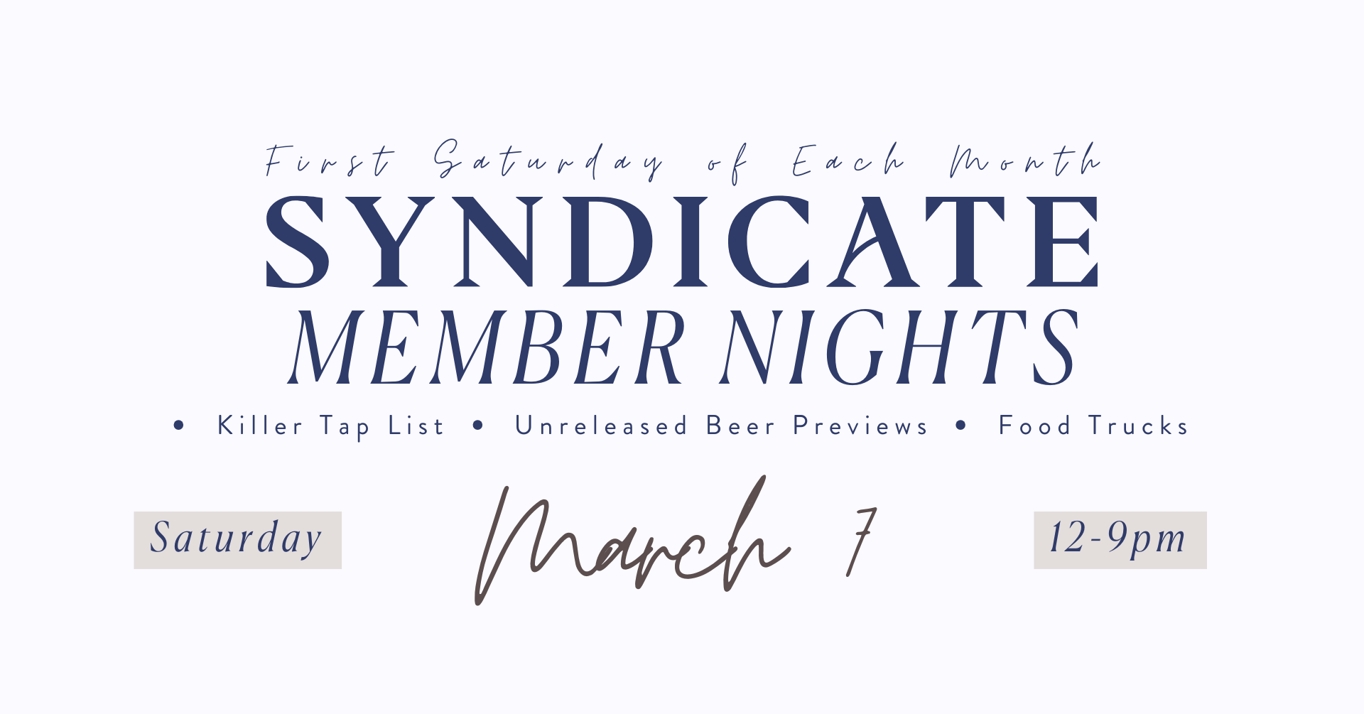 Come by the barrel house for a curated tap list including some unreleased previews and other special & unique beers. It’s a great time to pick up any held orders and hang out with fellow Syndicate members.