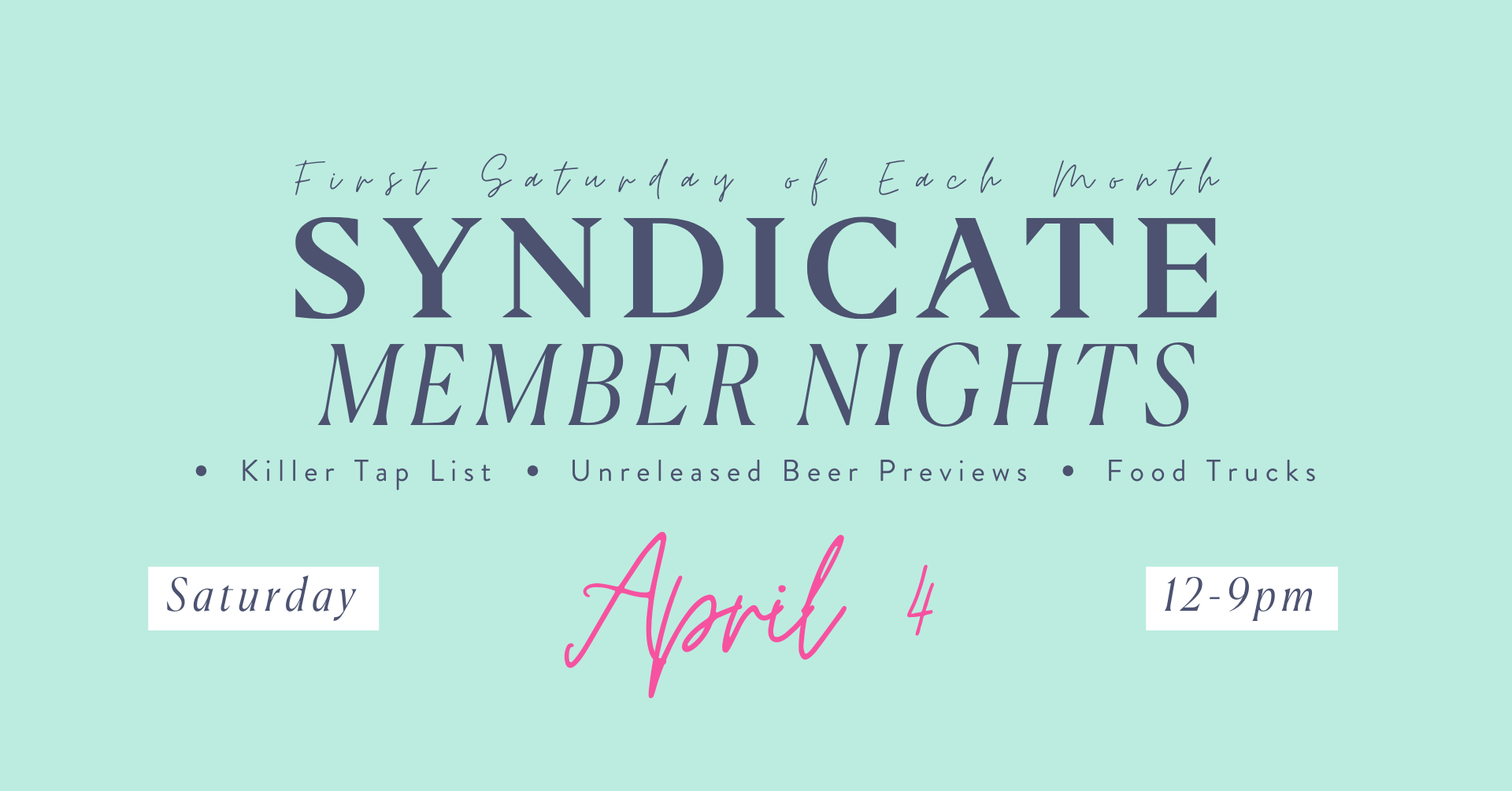 Come by the barrel house for a curated tap list including some unreleased previews and other special & unique beers. It’s a great time to pick up any held orders and hang out with fellow Syndicate members.