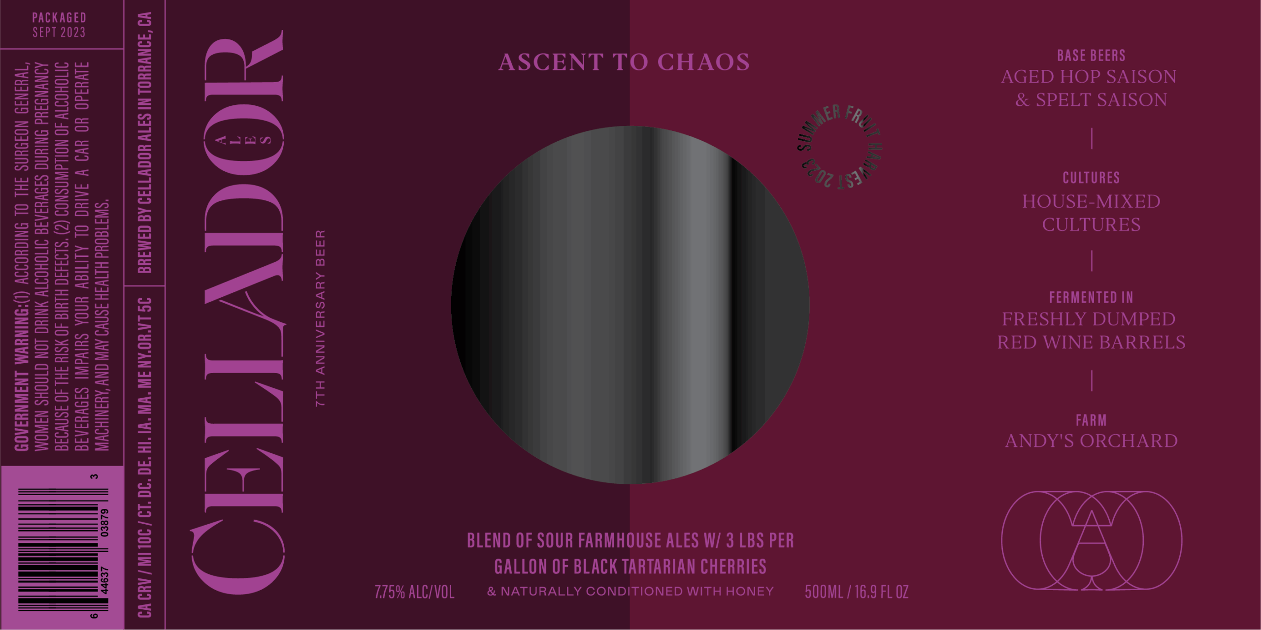 For these beers, we blended our Spelt and Aged Hop Saisons. We then split the batch and fruited each half with three pounds of cherries per gallon! One with Black Republican Cherries and the other with Black Tartarian Cherries. They aged for months on the fruit and have been resting in bottles for several months as well.